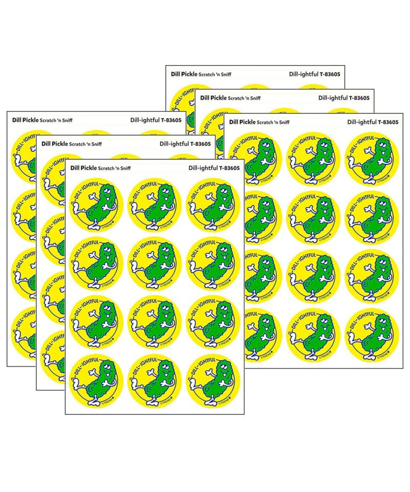 Get a whiff of this Dill-ightful pickle-scented sticker! TREND Scratch 'n Sniff Stinky Stickers from the '80s are BACK! Fun to collect, trade, and celebrate accomplishments and special occasions. Collectors will be happy to spot the star symbol to distinguish TREND Retro Stinky Stickers from those printed in the 1980s. Each sticker 1.25" diameter. Each pack includes 24 stickers on 2 sheets in 1 design. Sold as 6 packs for a total of 144 stickers.