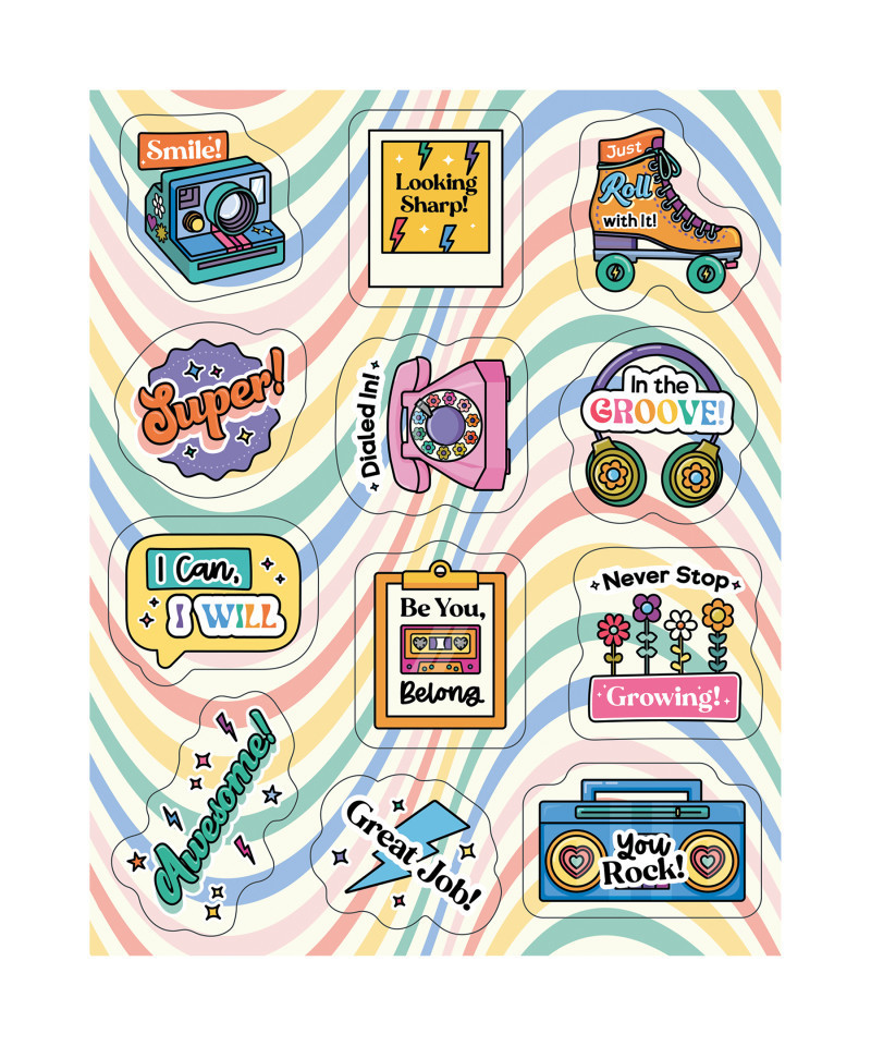From reward stickers to stickers for crafts, there are so many groovy ways to use Retro Remix Rainbow Motivational Stickers! The sticker pack includes 6 sheets of affirmation stickers (4.5" x 5.625") for a total of 72 inspirational stickers. Acid-free and lignin free, each sticker features a 70s and 80s stickers aesthetic, including roller skates, boombox, and polaroid camera design, with a positive affirmation. Use the stickers for kids classroom prizes or on schoolwork to motivate students. You can also use the stickers for your classroom's reward chart or incentive chart! These rainbow stickers are great for crafts, 70s party decorations and 80s party decorations or party favors, sticker charts, reward systems for chores, potty training, and more! Retro Remix, designed by Stephanie and Loreal of @HappilyEverElementary, partnered with Carson Dellosa to bring some fun, retro vibes to your learning environment.