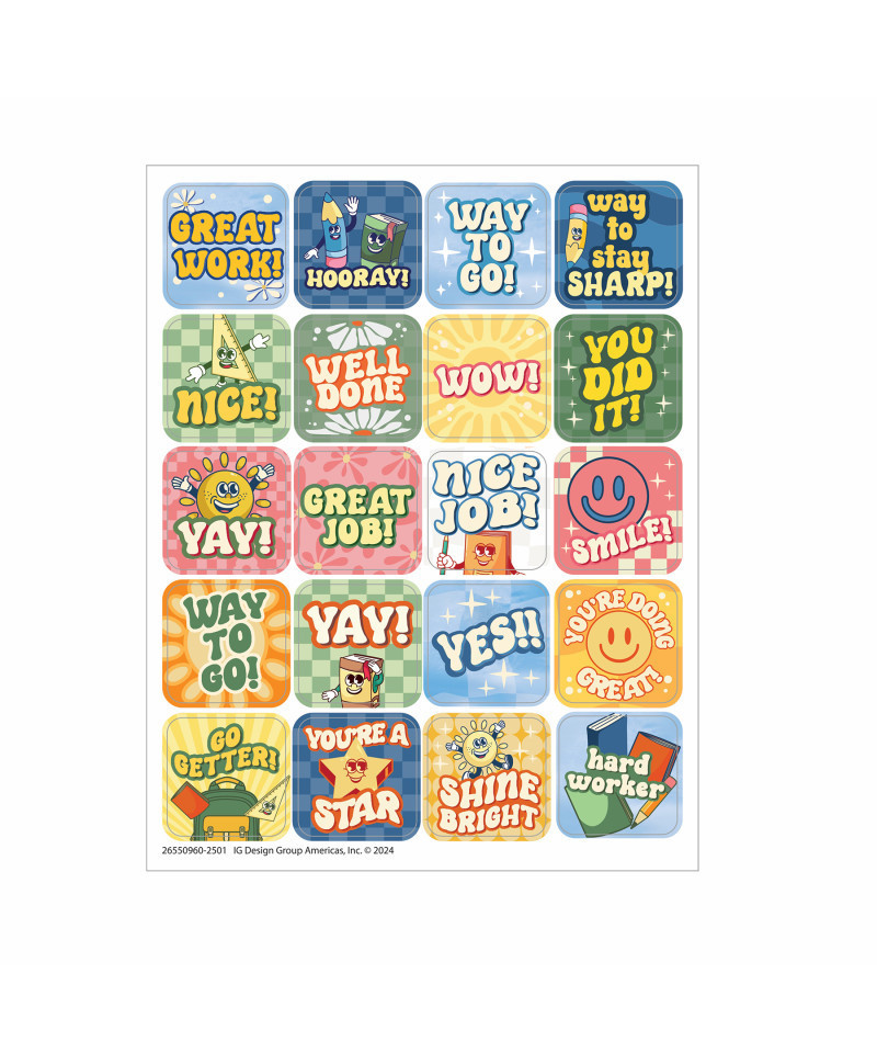Motivate students to do their best by adding Eureka Theme Stickers to assignments, notes, charts are more! Individual sticker measures 1" x 1". Bring the cool to school with the S'Cool Era Collection! Products feature a fun mix of motivational phrases, trendy checkered prints, and retro school icons! Each pack includes 120 self-adhesive stickers.