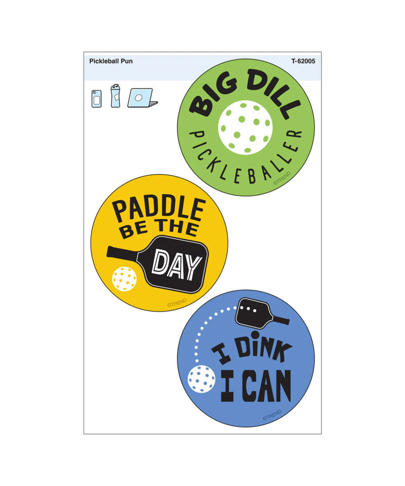Show off your passion for pickleball on water bottles, phones, laptops, tablets, and more. Great for most non-porous surfaces. One sheet per pack, 3 designs per title. Sticker sizes vary from 2-3/8" diameter to 3-7/8". Made in USA.