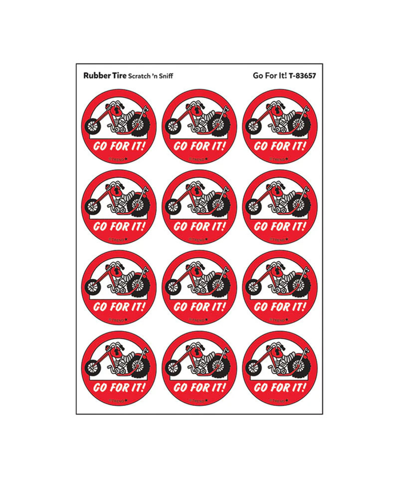 Get a whiff of this Go For It, rubber tire-scented motorcycle sticker! TREND Scratch n Sniff Stinky Stickers from the '80s are BACK! Fun to collect, trade, and celebrate accomplishments and special occasions. Collectors will be happy to spot the star symbol to distinguish TREND Retro Stinky Stickers from those printed in the 1980s.