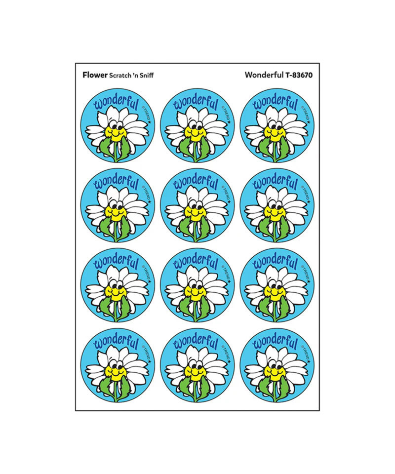 Get a whiff of this Wonderful, flower-scented sticker! TREND Scratch 'n Sniff Stinky Stickers from the '80s are BACK! Fun to collect, trade, and celebrate accomplishments and special occasions. Collectors will be happy to spot the star symbol to distinguish TREND Retro Stinky Stickers from those printed in the 1980s.