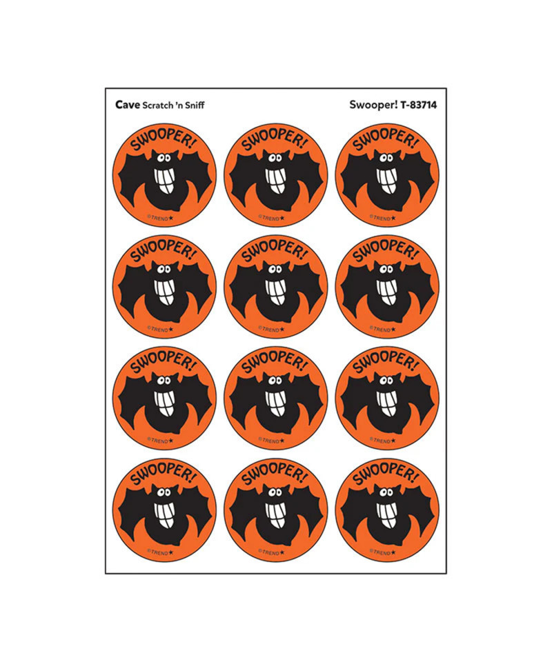 Get a whiff of this Swooper!, cave-scented bat sticker! TREND Scratch 'n Sniff Stinky Stickers from the 80s are BACK! Fun to collect, trade, and celebrate accomplishments and special occasions. Collectors will be happy to spot the star symbol to distinguish TREND Retro Stinky Stickers from those printed in the 1980s.