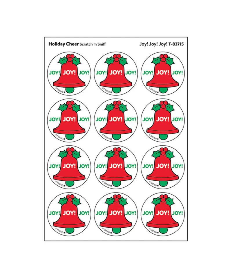 Get a whiff of this Joy Joy Joy Holiday Cheer-scented bell sticker! TREND Stinky Stickers from the 80s are BACK! Fun to collect, trade, and celebrate accomplishments and special occasions. Collectors will be happy to spot the star symbol to distinguish TREND Retro Stinky Stickers from those printed in the 1980s.