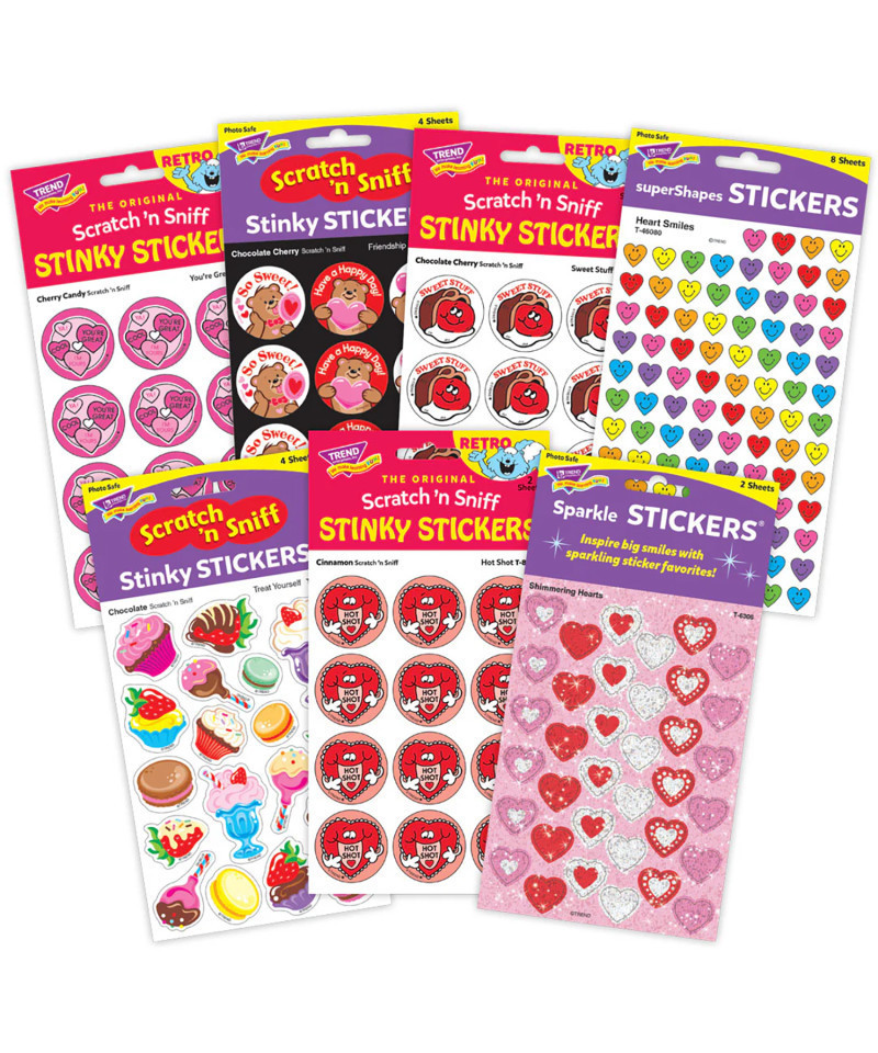 Hey, Valentine! Get ready for crafting and card-sending with this set of Valentine-themed stickers! Fun for Valentine's Day exchanges, party favors, and seasonal rewards. Set includes one pack each of seven stickers: Shimmering Hearts Sparkle Stickers; Hot Shot/Cinnamon scent, Sweet Stuff/Chocolate Cherry scent, and You're Great/Cherry Candy scent RETRO Scratch 'n Sniff Stinky Stickers; Friendship Bears/Chocolate Cherry scent and Treat Yourself/Chocolate scent Scratch 'n Sniff Stinky Stickers; and Heart Smiles superShapes Stickers. BONUS: This set also includes a printout of four Valentine Friends cards to share.