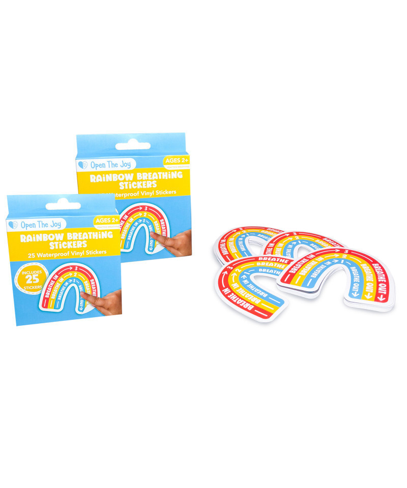 Promote mindfulness, calm, and emotional regulation in children with the Open the Joy Rainbow Breathing Sticker Class Pack. Each pack includes 25 vibrant 3.5-inch vinyl stickers, each guiding students through a simple rainbow breathing exercise. Perfect for classrooms, counseling sessions, camps, or calming corners, these stickers make learning stress-relief techniques fun and engaging. Durable and waterproof, they can be applied to notebooks, water bottles, or any personal item, encouraging kids to practice breathing exercises anytime, anywhere. The colorful rainbow design adds a playful touch while supporting focus, relaxation, and social-emotional development. Sold as 2 packs for a total of 50 stickers.