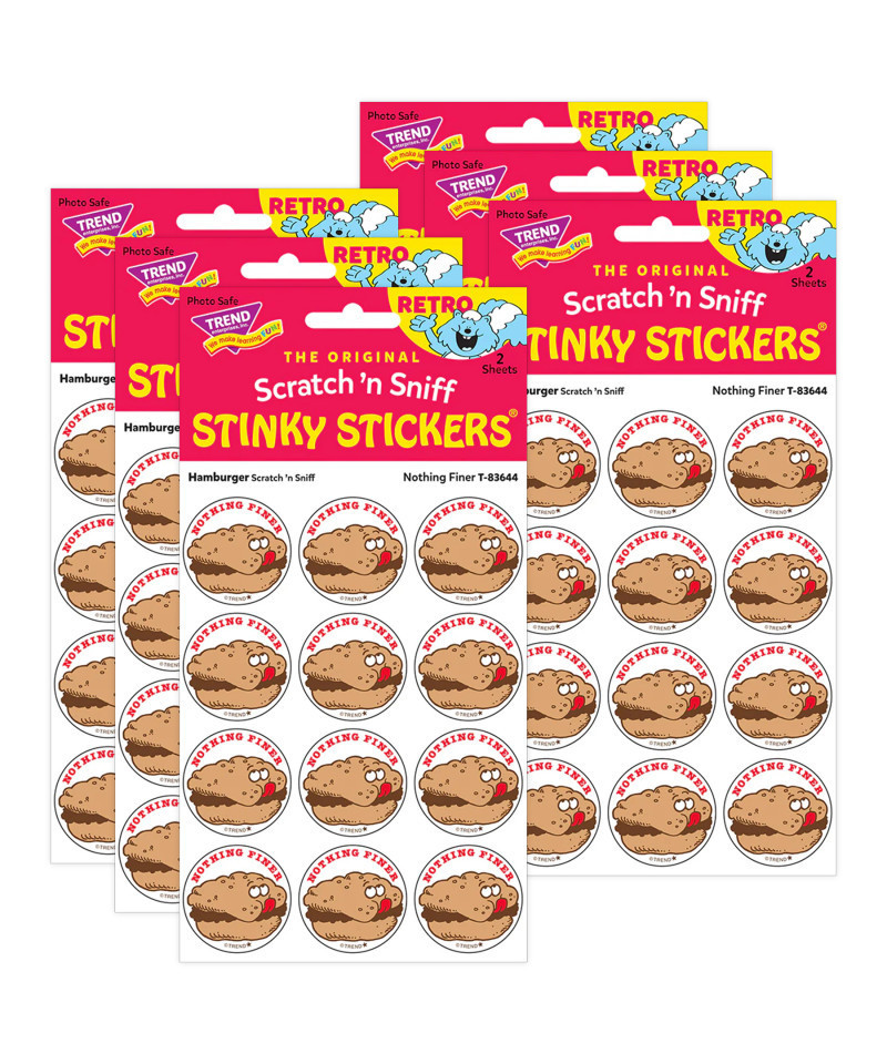 Get a whiff of this Nothing Finer, hamburger-scented sticker! TREND Scratch n Sniff Stinky Stickers from the '80s are BACK! Fun to collect, trade, and celebrate accomplishments and special occasions. Collectors will be happy to spot the star symbol to distinguish TREND Retro Stinky Stickers from those printed in the 1980s. Each pack includes 2 sheets / 24 stickers, measuring 1-1/4" diameter. Ages 3 and up. Made in the USA. Sold as 6 packs.
