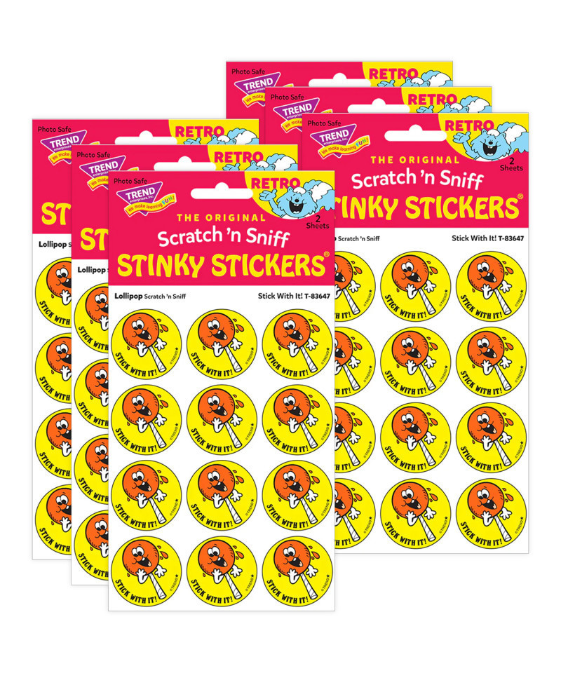 Get a whiff of this Stick With It!, lollipop-scented sticker! TREND Scratch n Sniff Stinky Stickers from the '80s are BACK! Fun to collect, trade, and celebrate accomplishments and special occasions. Collectors will be happy to spot the star symbol to distinguish TREND Retro Stinky Stickers from those printed in the 1980s. Each pack includes 2 sheets / 24 stickers, measuring 1-1/4" diameter. Ages 3 and up. Made in the USA. Sold as 6 packs.