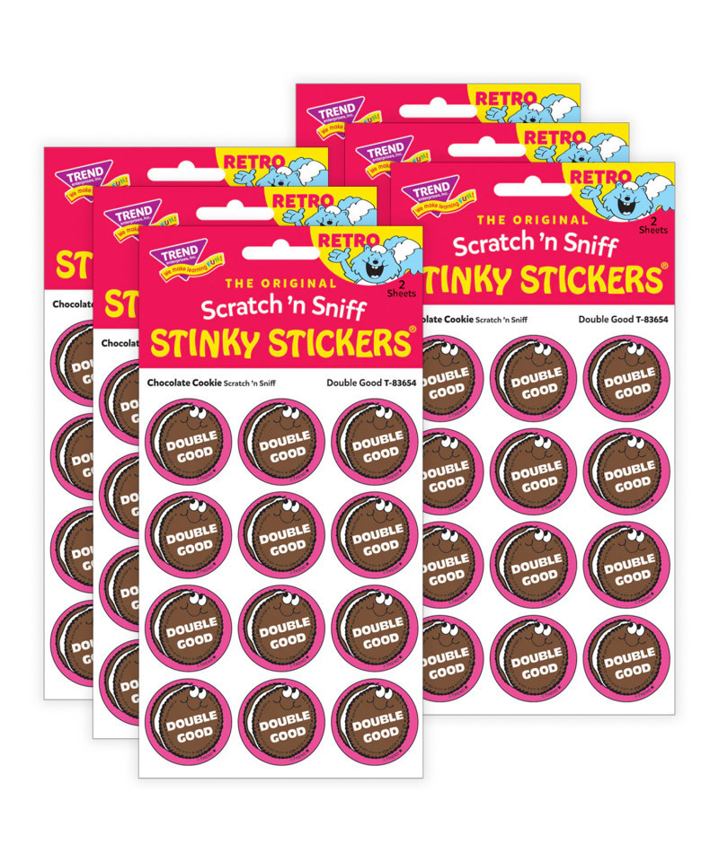 Get a whiff of this Double Good, chocolate cookie-scented sticker! TREND Scratch n Sniff Stinky Stickers from the 80s are BACK! Fun to collect, trade, and celebrate accomplishments and special occasions. Collectors will be happy to spot the star symbol to distinguish TREND Retro Stinky Stickers from those printed in the 1980s. Sold as 6 packs.