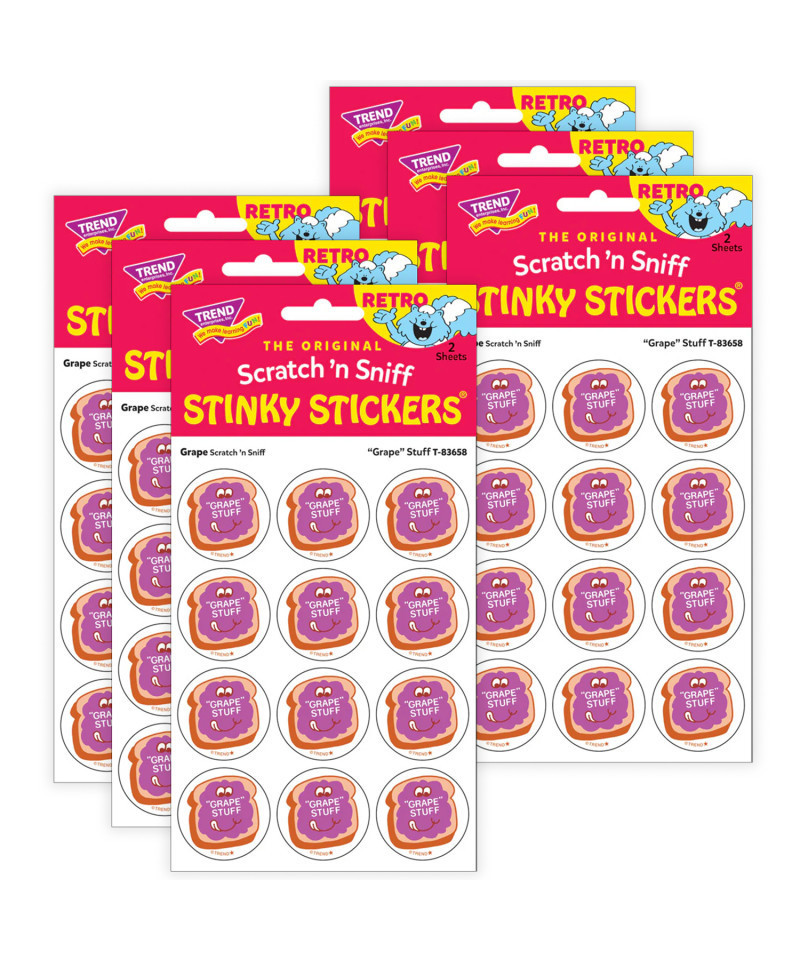Get a whiff of this "Grape" Stuff, grape-scented toast sticker! TREND Scratch n Sniff Stinky Stickers from the 80s are BACK! Fun to collect, trade, and celebrate accomplishments and special occasions. Collectors will be happy to spot the star symbol to distinguish TREND Retro Stinky Stickers from those printed in the 1980s. Sold as 6 packs.