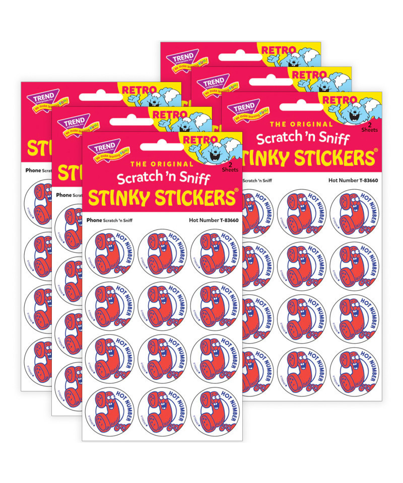 Get a whiff of this Hot Number, cinnamon phone-scented sticker! TREND Scratch n Sniff Stinky Stickers from the 80s are BACK! Fun to collect, trade, and celebrate accomplishments and special occasions. Collectors will be happy to spot the star symbol to distinguish TREND Retro Stinky Stickers from those printed in the 1980s. Sold as 6 packs.