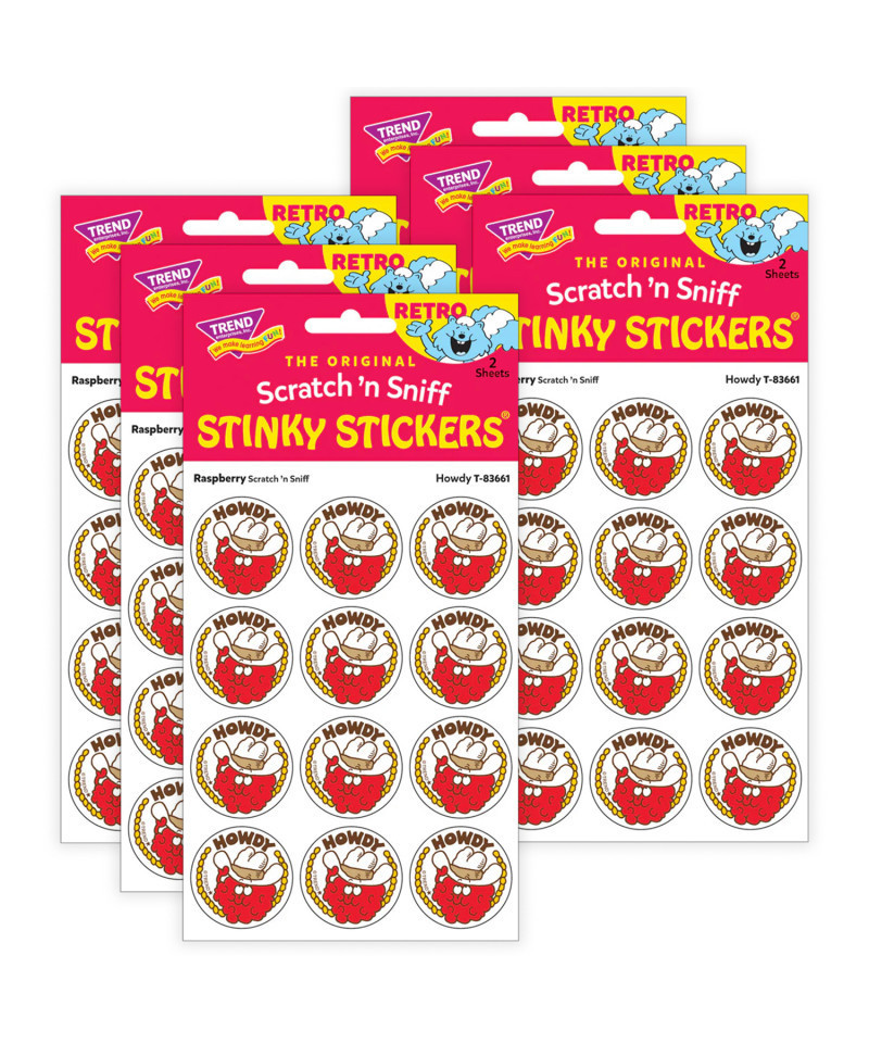 Get a whiff of this Howdy, raspberry-scented sticker! TREND Scratch 'n Sniff Stinky Stickers from the '80s are BACK! Fun to collect, trade, and celebrate accomplishments and special occasions. Collectors will be happy to spot the star symbol to distinguish TREND Retro Stinky Stickers from those printed in the 1980s. Sold as 6 packs.