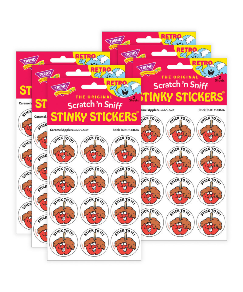 Get a whiff of this Stick To It, caramel apple-scented sticker! TREND Scratch n Sniff Stinky Stickers from the 80s are BACK! Fun to collect, trade, and celebrate accomplishments and special occasions. Collectors will be happy to spot the star symbol to distinguish TREND Retro Stinky Stickers from those printed in the 1980s. Sold as 6 packs.
