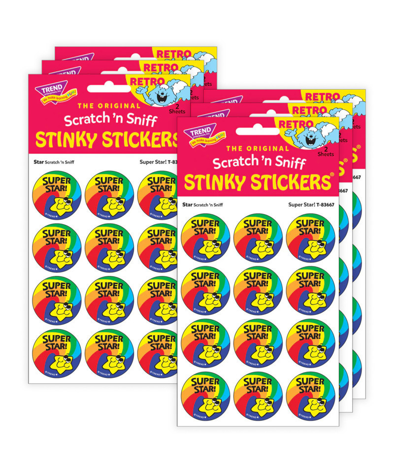 Get a whiff of this Super Star!, star-scented sticker! TREND Scratch 'n Sniff Stinky Stickers from the '80s are BACK! Fun to collect, trade, and celebrate accomplishments and special occasions. Collectors will be happy to spot the star symbol to distinguish TREND Retro Stinky Stickers from those printed in the 1980s. Sold as 6 packs.