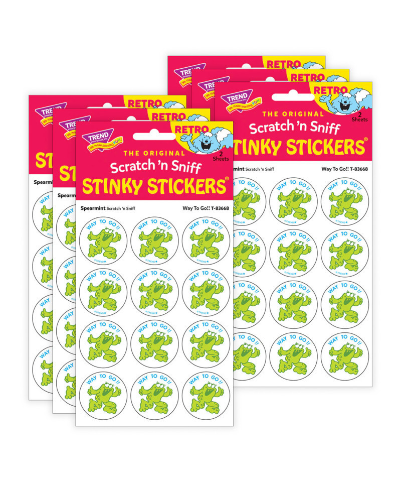 Get a whiff of this Way to Go!, spearmint-scented frog sticker! TREND Scratch n Sniff Stinky Stickers from the '80s are BACK! Fun to collect, trade, and celebrate accomplishments and special occasions. Collectors will be happy to spot the star symbol to distinguish TREND Retro Stinky Stickers from those printed in the 1980s. Sold as 6 packs.