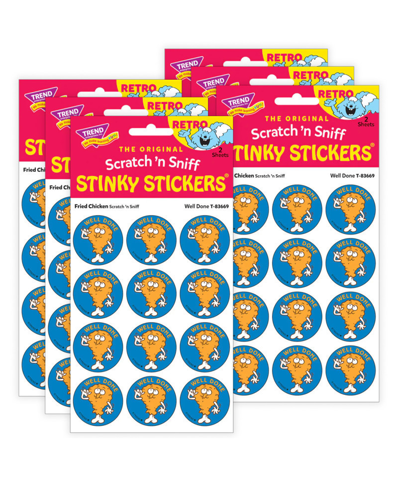 Get a whiff of this Well Done, fried chicken-scented sticker! TREND Scratch n Sniff Stinky Stickers from the '80s are BACK! Fun to collect, trade, and celebrate accomplishments and special occasions. Collectors will be happy to spot the star symbol to distinguish TREND Retro Stinky Stickers from those printed in the 1980s. Sold as 6 packs.