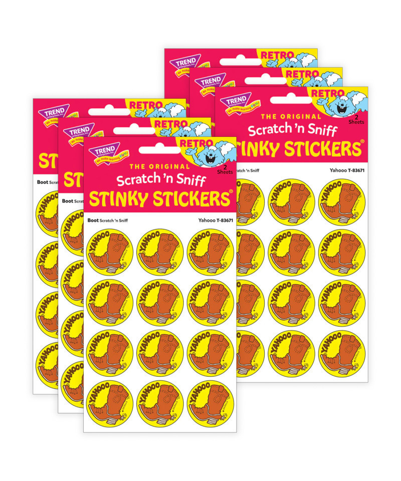 Get a whiff of this Yahooo, boot-scented sticker! TREND Scratch 'n Sniff Stinky Stickers from the '80s are BACK! Fun to collect, trade, and celebrate accomplishments and special occasions. Collectors will be happy to spot the star symbol to distinguish TREND Retro Stinky Stickers from those printed in the 1980s. Sold as 6 packs.