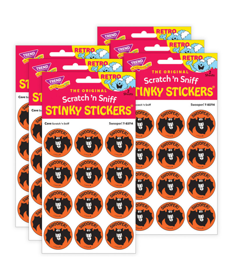 Get a whiff of this Swooper!, cave-scented bat sticker! TREND Scratch 'n Sniff Stinky Stickers from the 80s are BACK! Fun to collect, trade, and celebrate accomplishments and special occasions. Collectors will be happy to spot the star symbol to distinguish TREND Retro Stinky Stickers from those printed in the 1980s. Sold as 6 packs.