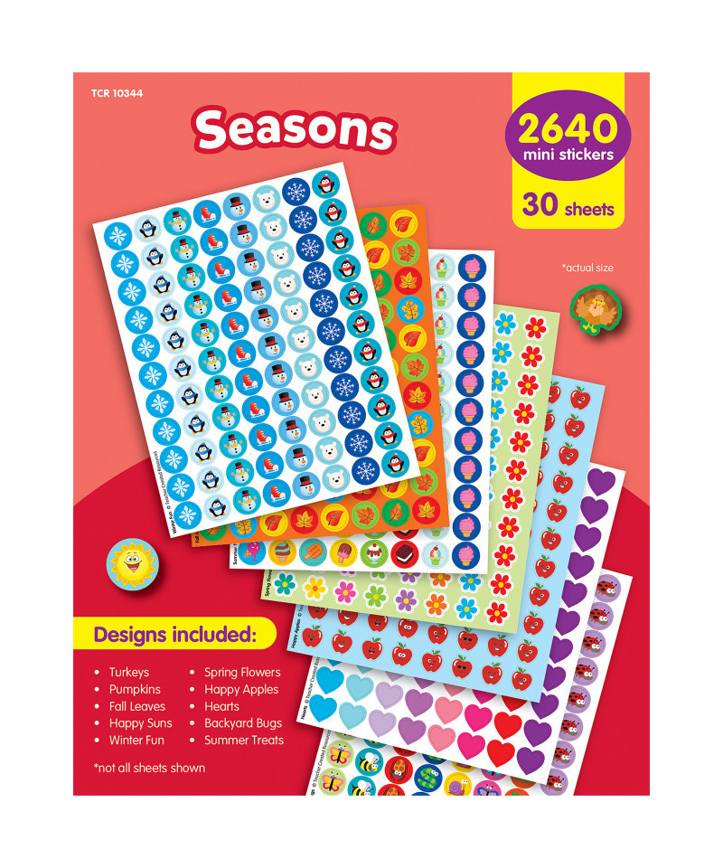 - Includes 2,640 mini stickers: motivate students all year round with these seasonal mini stickers! Pack includes 2,640 in the following designs: turkeys, pumpkins, fall leaves, happy suns, winter fun, spring flowers, happy apples, hearts, backyard bugs, and summer treats. Stickers measure about 7/16" in diameter.