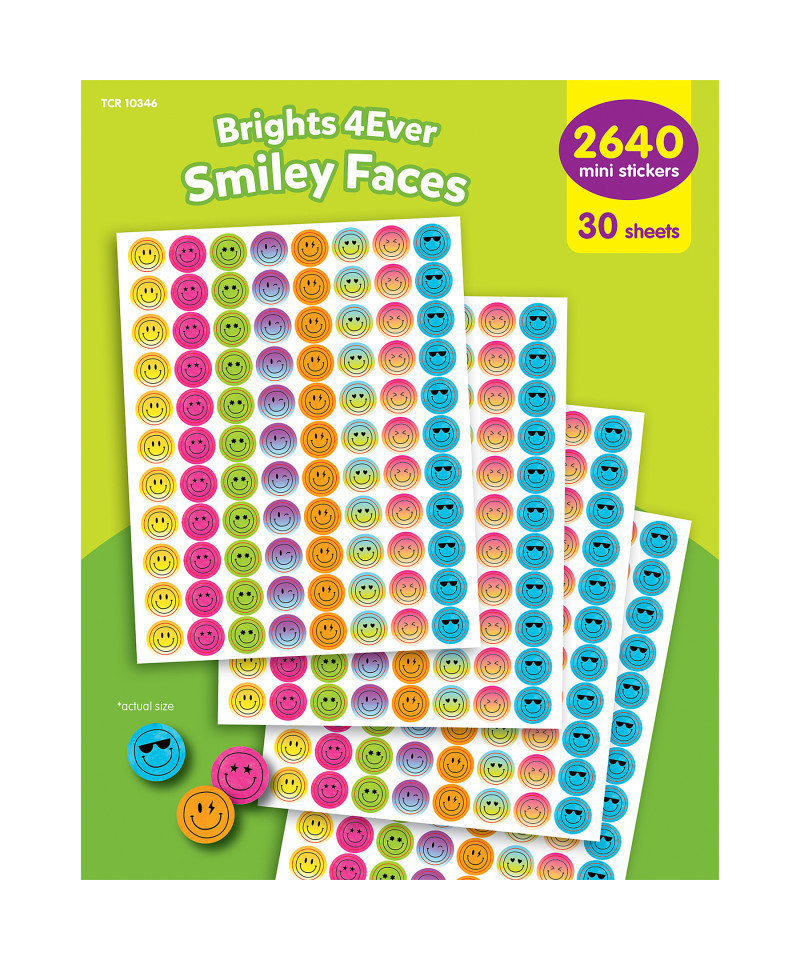 - Includes 2,640 mini stickers: make every student smile with these mini reward stickers. Pack includes 8 modern happy face designs in 8 colors. Stickers measure about 7/16" in diameter.