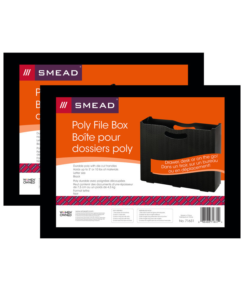 Manage multiple projects within a single portable file box. Sturdy poly file box holds up to 3" of files or materials and can be used again and again. The poly file box is a handy desktop filing system for either file folders or hanging file folders. In drawer, on desk, on the go! Sold as a pack of 2 file boxes.