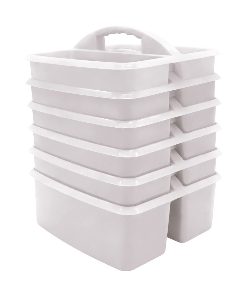 These storage caddies are a handy tote for your markers, calculators, timers, manipulatives, and many more small items that you want to keep within reach. These caddies are made from durable plastic and includes divided compartments for easy organizing. Each caddy measures 9" L x 9 1/4" W x 5 1/4" H. Sold as a pack of 6 caddies.