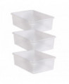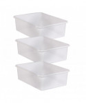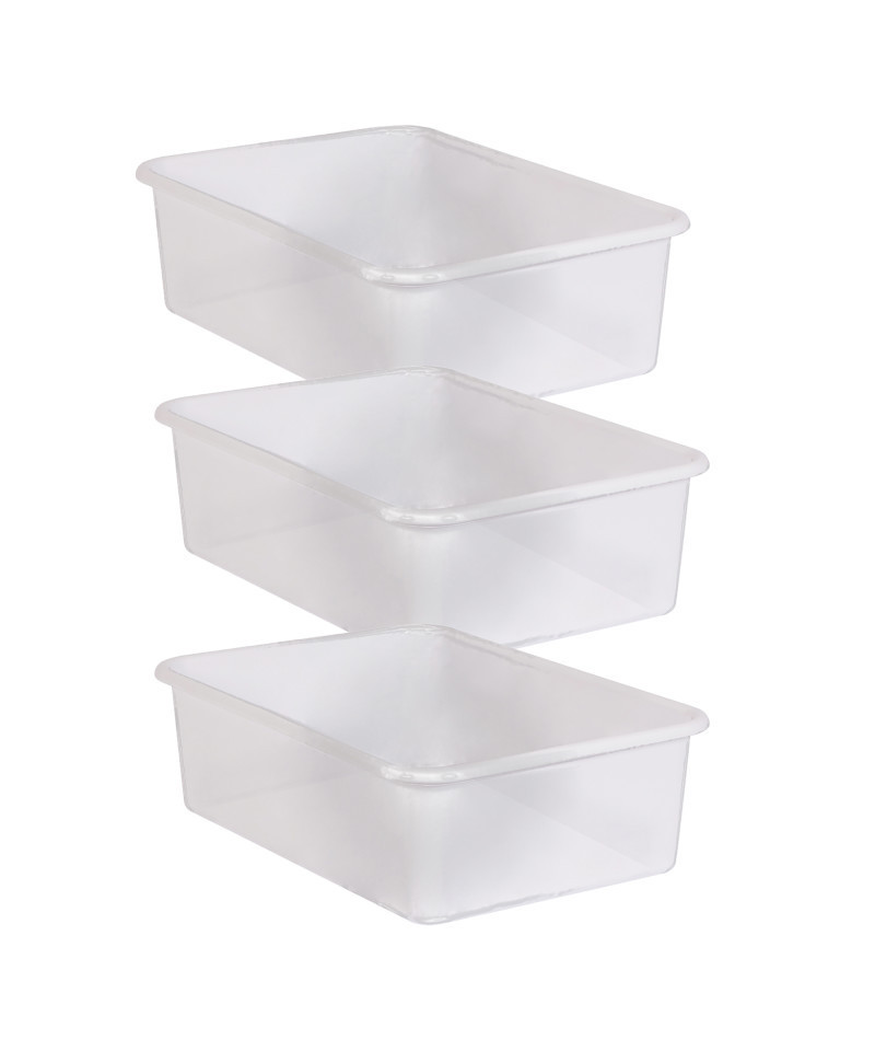 Create a beautifully organized classroom with these large storage bins. Keep books, notepads, toys, games, and supplies in these decorative organizers that feature a sturdy plastic design. Multiple bins can be stacked for easy storage. Each bin measures 11-1/2" L x 16-1/4" W x 5" H. Clear plastic storage offers the style and functionality to create an organized classroom that is clutter free, with the added bonus of displaying the contents so you can see everything you need. Sold as a pack of 3 bins.
