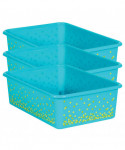 Create a beautifully organized classroom with these large storage bins. Keep books, notepads, toys, games, and supplies in these decorative organizers that feature a sturdy plastic design. Multiple bins can be stacked for easy storage. Each bin measures 11-1/2" L x 16-1/4" W x 5" H. Sold as a pack of 3 storage bins.