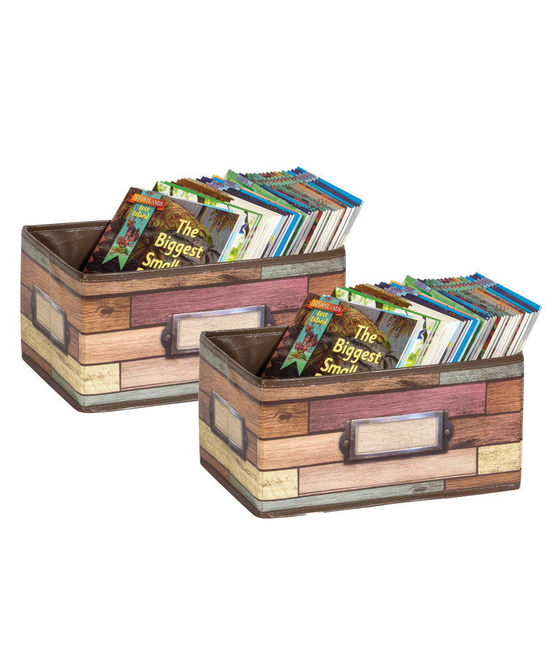 Classroom organization is easy with this decorative Reclaimed Wood Small Storage Bin. Keep manipulatives, books, notepads, educational toys, games, and supplies in these decorative organizers that feature a write-on/wipe-off surface for convenient labeling and easy cleaning. The durable bins can also be folded for easy storage so you can take them out and use them year after year. Measures approximately 8" x 11" x 5". Sold as a pack of 2 bins.