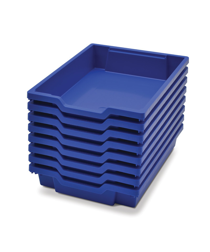Gratnells Shallow Tray fits all standard school furniture. These storage trays are molded in polypropylene with no rough edges and are fully stackable. Colorfast and chemical resistant. Feature a built-in carry handle. Fully recyclable and come with a 5 year guarantee. Perfect for many other uses such as home, office and industrial. Tray measures 12.3" x 16.8" x 3". Pack of 8 trays.