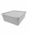Stow things away with set on lids and stack them high. This tub holds plenty of what you need to store. Great for school or home organization. Made of non-toxic sturdy plastic. Includes lid. Measures 16" x 13-1/2" x 5-1/2".