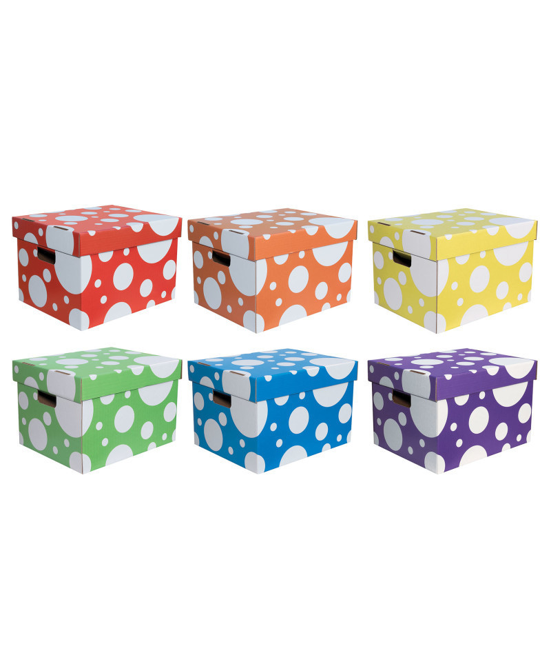 These colorful totes offer lightweight storage solutions that are sturdy, roomy, and stack easily. Made of corrugated cardboard, totes can accommodate hanging files and file folders. Carrying handles provide ease of use and portability. Each pack of 6 comes in fun, polka-dot designs in Blue, Red, Yellow, Purple, Green and Orange. Recycled and recyclable.