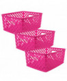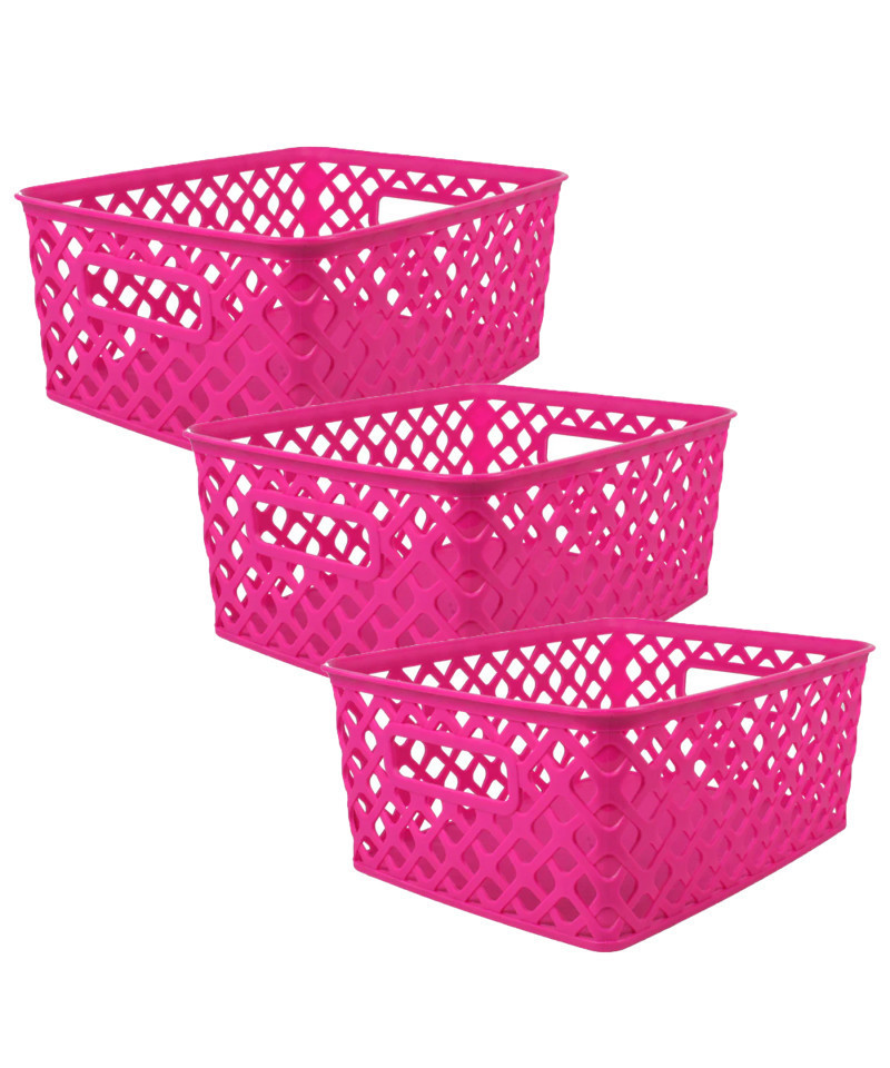 Romanoff Woven Baskets are the perfect addition to our storage collection. The woven pattern dresses up these storage solutions, the sturdy construction can stash items of all sizes, and the bright colors will jazz up any classroom! Measures 10"L x 7.75"W x 4.25"H. Sold as a pack of 3 baskets.