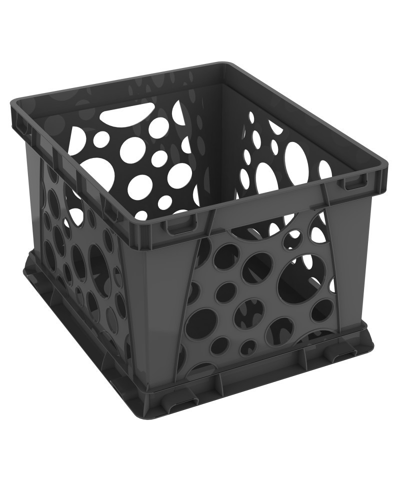 The Storex storage crate features rugged dependability with a more up-to-date style. The traditional milk crate has received upgrades which include a solid bottom, easy grip handles, and improved drop test performance. It holds letter or legal hanging files and folders and can be safely stacked up to six crates high. Stack them on their side to creates a custom shelf unit or toss them in your car for mobile storage. These crates interlock in every direction. Crate measures 17.25"L x 14.25"W x 10.5"H. Interior measures 15.12"L x 12.23"W x 10.37"H.