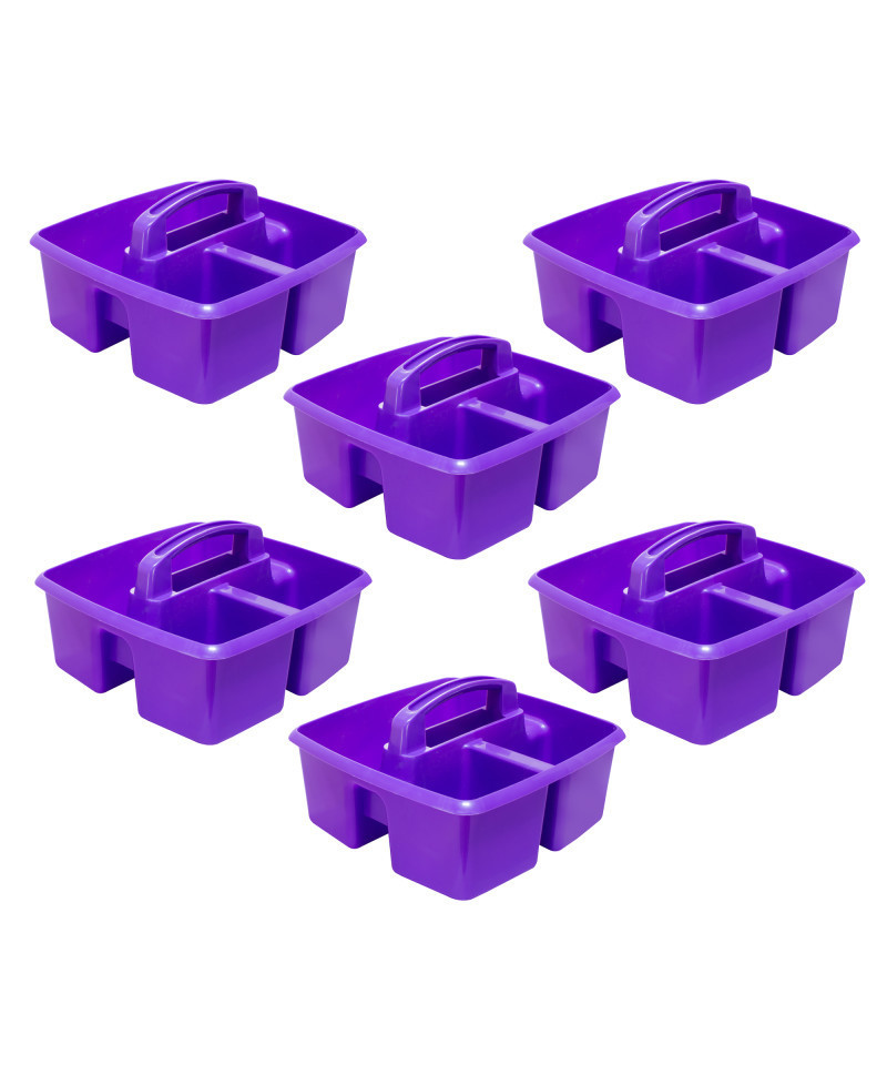 Sort your supplies for easy use and storage. The Caddy has 3 compartments (1 large and 2 small). The rounded handle has no sharp edges. Completely washable and dishwasher safe. Take your supplies from the closet to the work table quickly and simply. Small compartment interior dimensions are 3.5" long x 3.5" wide x 3.75". Large compartment interior dimensions are 8" long x 3.5" wide x 3.75" deep. Overall dimensions: 9.25"L x 9.25"W x 5.25"H. Sold as a pack of 6 caddies.