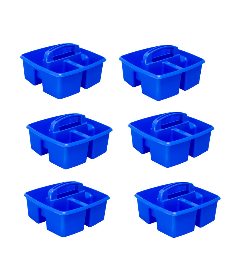 Sort your supplies for easy use and storage. The Caddy has 3 compartments (1 large and 2 small). The rounded handle has no sharp edges. Completely washable and dishwasher safe. Take your supplies from the closet to the work table quickly and simply. Small compartment interior dimensions are 3.5" long x 3.5" wide x 3.75". Large compartment interior dimensions are 8" long x 3.5" wide x 3.75" deep. Overall dimensions: 9.25"L x 9.25"W x 5.25"H. Sold as a pack of 6 caddies.