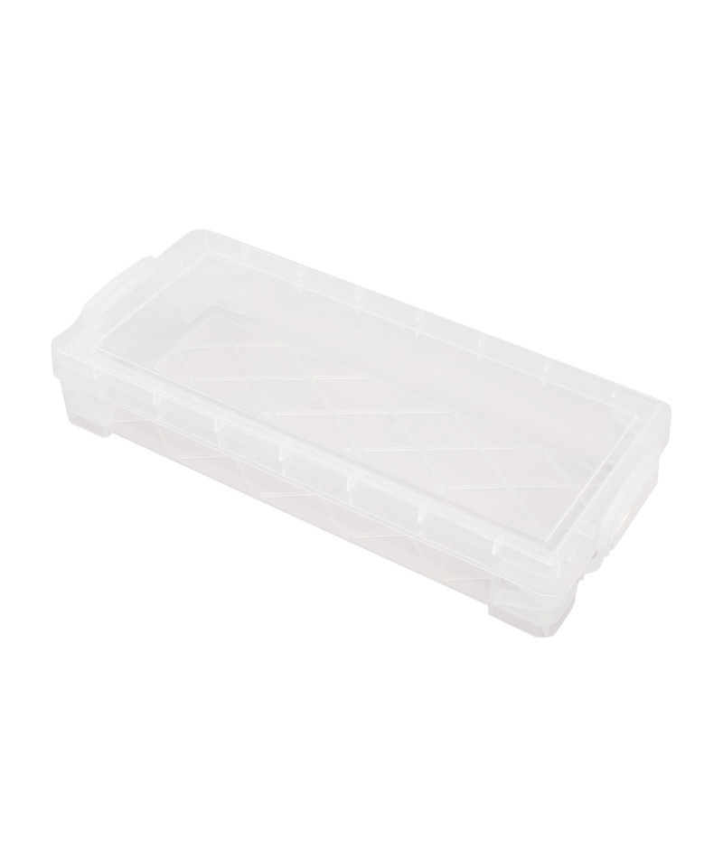 The Super Stacker Pencil Box is ideal for storing pencils, pens, markers, crayons, and more. Lock tight handles keep contents secure, while stackable design helps save space. Measures 3.75" x 8.375"L x 1.625"H.