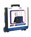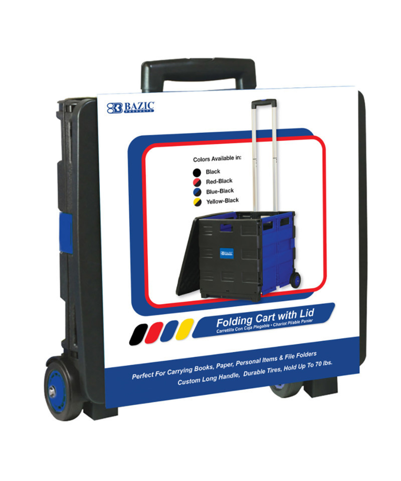 This 2-wheel plastic cart is foldable, so you can assemble it when you need to use it, and fold it down for storage. It has long handle that has few adjustable heights to match your height for comfort use. It is sturdy and can hold up to 70 lbs. Comes with a lid so you can protect your belongings from rain or wind; you can even pile more items on top of the lid to save a trip. Ideal for transporting books, documents, arts & crafts items and more! A great tool for teachers. Black and Blue for a sporty feel and greater look.