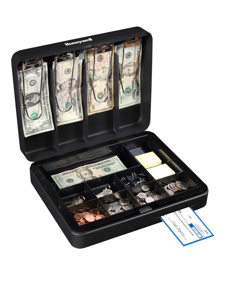 The Honeywell model 6113 deluxe cash box includes a removable cash tray with 1 bill slot, 8 coin slots, and 4 currency clips in lid. This cash box also has a convenient check deposit slot on front. It features a durable, scratch-resistant powder coat finish, additional storage under tray and a convenient carry handle. This Honeywell security box is backed by a 1 year limited warranty.