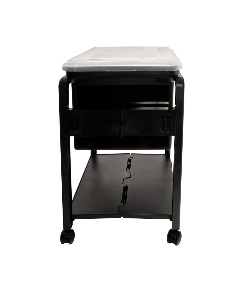 A cart that fulfils practicality and portability needs. This lightweight cart folds open to hold a storage tote accompanied by a lower shelf for additional supplies. Smooth-rolling castors allow for enhanced mobility. The included tote and snap-tight lid are perfect for legal-size letters and folders. Assembled cart measures: 18.5"L x 14.5"W x 21.75"H.