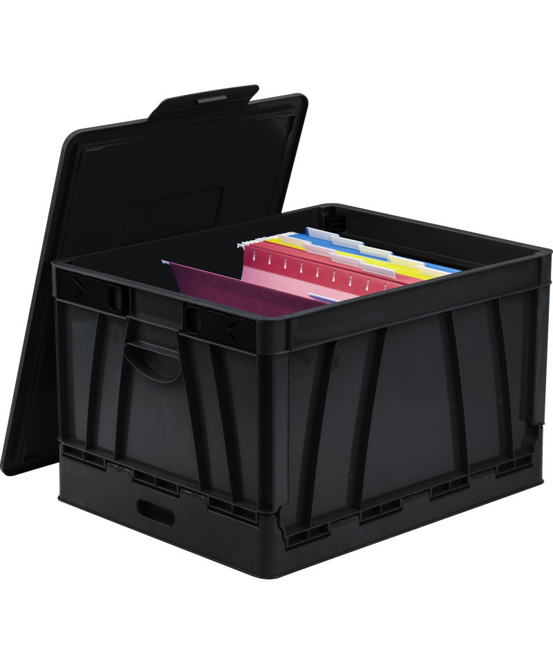 Open it when you need it, fold it when you don't. Keep this crate folded and handy in the office for files, in the car for supplies and groceries, or anywhere your would need a quick and useful storage box. Holds Letter or legal hanging file folders. Folds to only 3" thick.