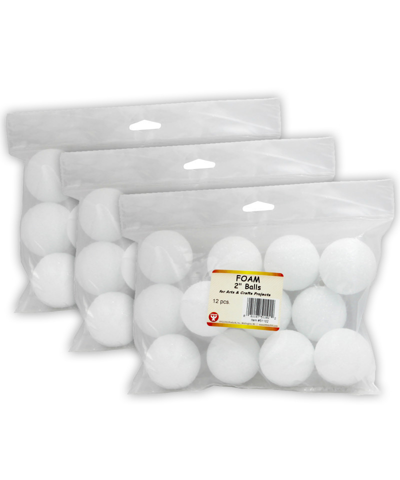 Craft Foam balls are the foundation of many fantastic crafts projects and decorations. Polystyrene Foam is simple to decorate, yet yields professional looking crafts. Use as a base for floral arrangements or craft centerpieces. Teachers love foam balls for science projects and models; you can even create a model solar system with the large selection of sizes! These balls are popular for creating and decorating holiday ornaments and decorations. So get out some tissue paper, sequins, paint and glue, and let your creativity start running! Foam Balls measure 2" in diameter. Each pack includes 12 craft foam balls. Sold as 3 packs for a total of 36 foam balls.
