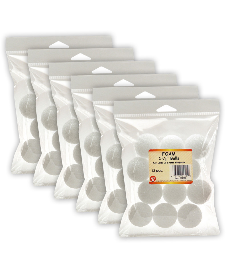 Craft Foam balls are the foundation of many fantastic crafts projects and decorations. Polystyrene Foam is simple to decorate, yet yields professional looking crafts. Use as a base for floral arrangements or craft centerpieces. Teachers love foam balls for science projects and models; you can even create a model solar system with the large selection of sizes! These balls are popular for creating and decorating holiday ornaments and decorations. So get out some tissue paper, sequins, paint and glue, and let your creativity start running! Foam Balls measure 1-1/2" in diameter. Each pack includes 12 craft foam balls. Sold as 6 packs for a total of 72 foam balls.