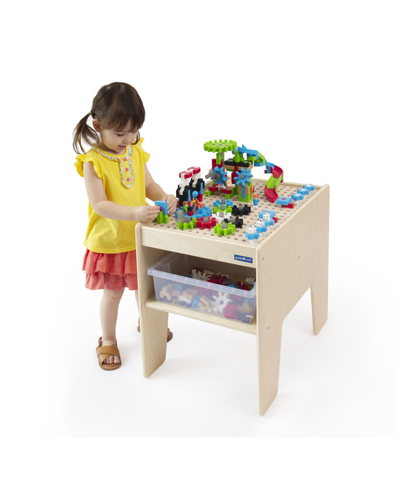 Children 3 and up will develop social emotional and STEM-based skills during hands-on, collaborative playtime around the IO Blocks STEM Table. This all-in-one set includes a durable, easy-to-clean birch table with raised grid tabletop for stabilized builds using the 200 gears, slides IO people and standard IO Blocks pieces. Keep pieces organized and accessible using the included 2 clear storage bins. Adult assembly required. Table measures 22" W x 16.5" D x 20" H (55cm W x 41cm D x 50cm H).