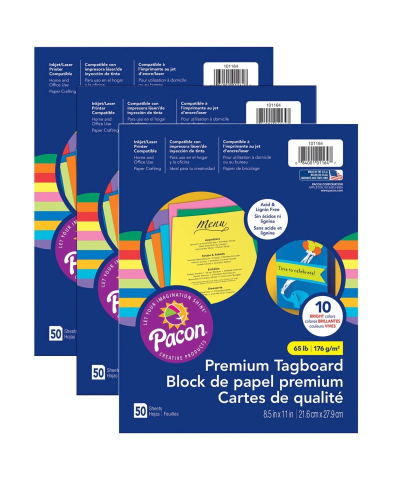 Strong 65 lb. paper great for art projects, crafts, card and recipe making and more. Inkjet and laser printer compatible. Ten bright colors per package. Colors include: Violet, Pumpkin, Hyper Yellow, Rojo Red, Hyper Lime, Hyper Pink, Cobalt Blue, Marine Blue, Emerald Green and Gold. Acid-free and recyclable. Each pack includes 50 sheets. Each sheet measures 8.5" x 11". Sold as 3 packs for a total of 150 sheets.