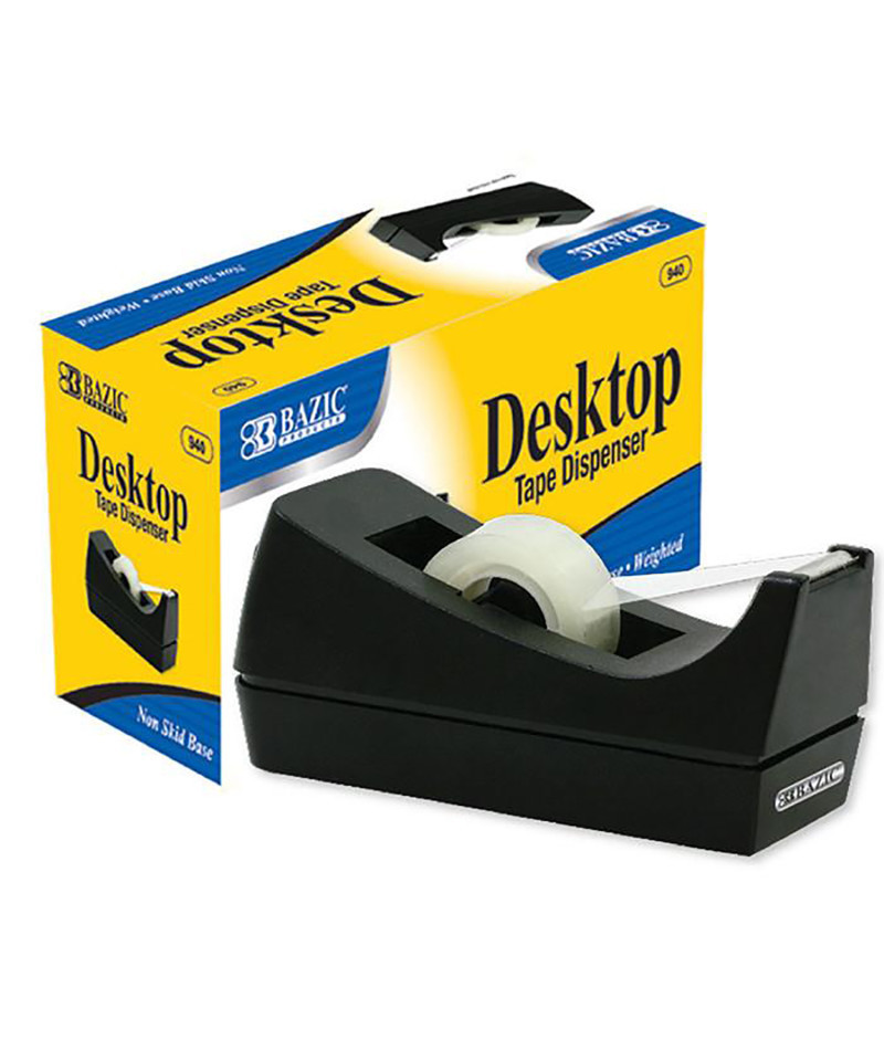 Made of sturdy high-impact plastic with weighted nonskid base, for one-handed tape dispensing