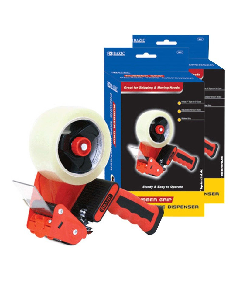 Rubber grip premium comfort packing tape dispenser holds 2" tape on a 3" core. Packing tape is not included. Side loading for convenience. Keeps tape easy to get when you need it. Pack of 2 tape dispensers.