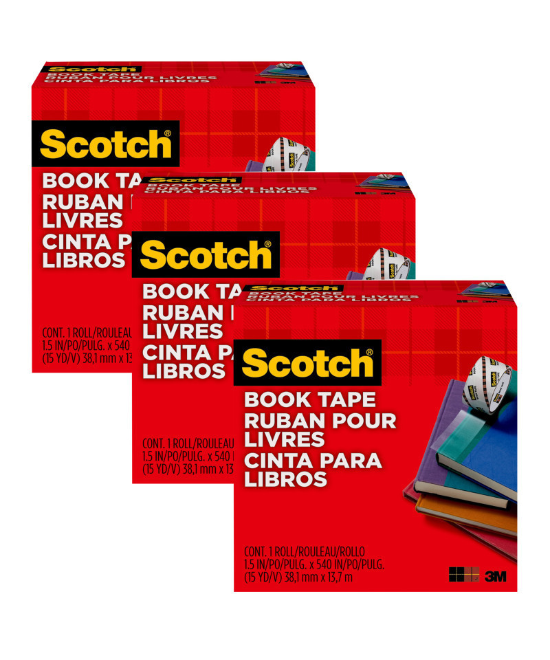 Scotch Book Tape is excellent for repairing, reinforcing, protecting and covering bound edges and surfaces. Transparent, conformable and permanent. Unwinds easily. Use on books, magazines, pamphlets, record album jackets and more. Each roll measures 1-1/2 in x 15 yd, with a 3 in. core. Sold as a pack of 3 rolls of book tape.