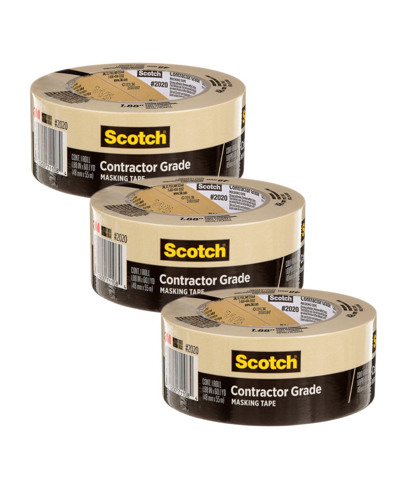 Scotch Contractor Grade Masking Tape is a general purpose masking tape designed for use on non-damageable surfaces. Use on vinyl, carpet, metal, and plastic for the protection you need to get the job done. Scotch Contractor Grade Masking Tape holds to surfaces for up to 3 days and then removes easily without leaving any sticky residue behind. Sold as a pack of 3 rolls.