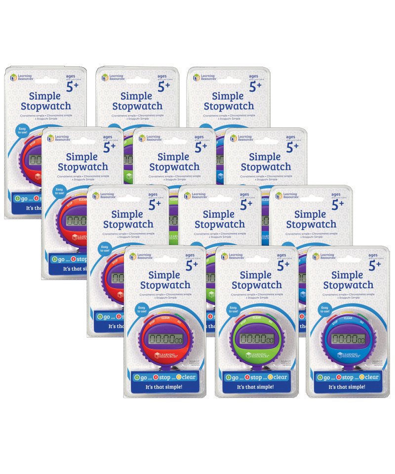 On your mark...get set...go! Great for races, games and other timed activities, this stopwatch is easy to use, making it perfect for both children and adults. Features only 3 buttons-green for go, red for stop, and yellow for clear. Supports science investigations, timed math exercises, elapsed time tracking and a variety of classroom management needs. Shows minutes, seconds and 1/100 seconds on an easy-to-read display. Measures 3"H. Requires one 1.5V button-cell battery, included. Ages 5+. Sold as a pack of 12 in assorted colors (no color choice).